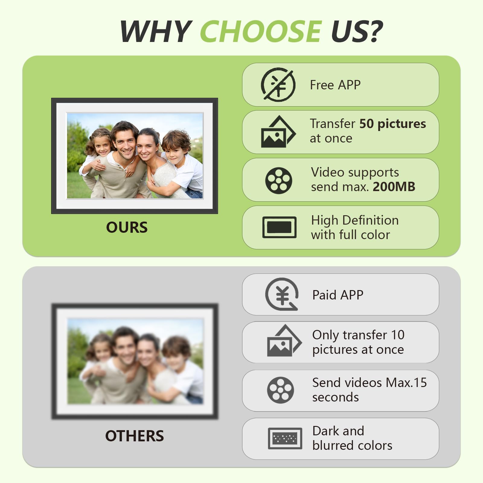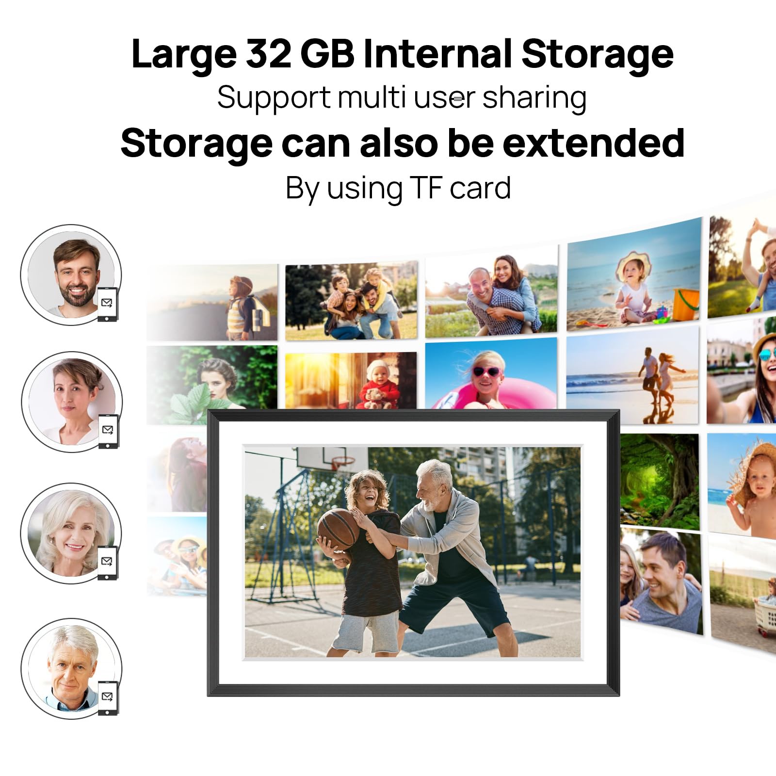- 【SHARE PHOTOS AND VIDEO PRIVATELY, SAFELY】 Send photos or small videos (Max.15 seconds) directly to FRAMEO APP from anywhere in the world, friends and family can enjoy your wonderful moments within seconds on Akimart WIFI frame. The ''frameo'' App for iOS and Android gives you full control over your frame. Built-in 32GB memory, Support Mirco SD Card extend storage, also can Import and Export pictures or videos.