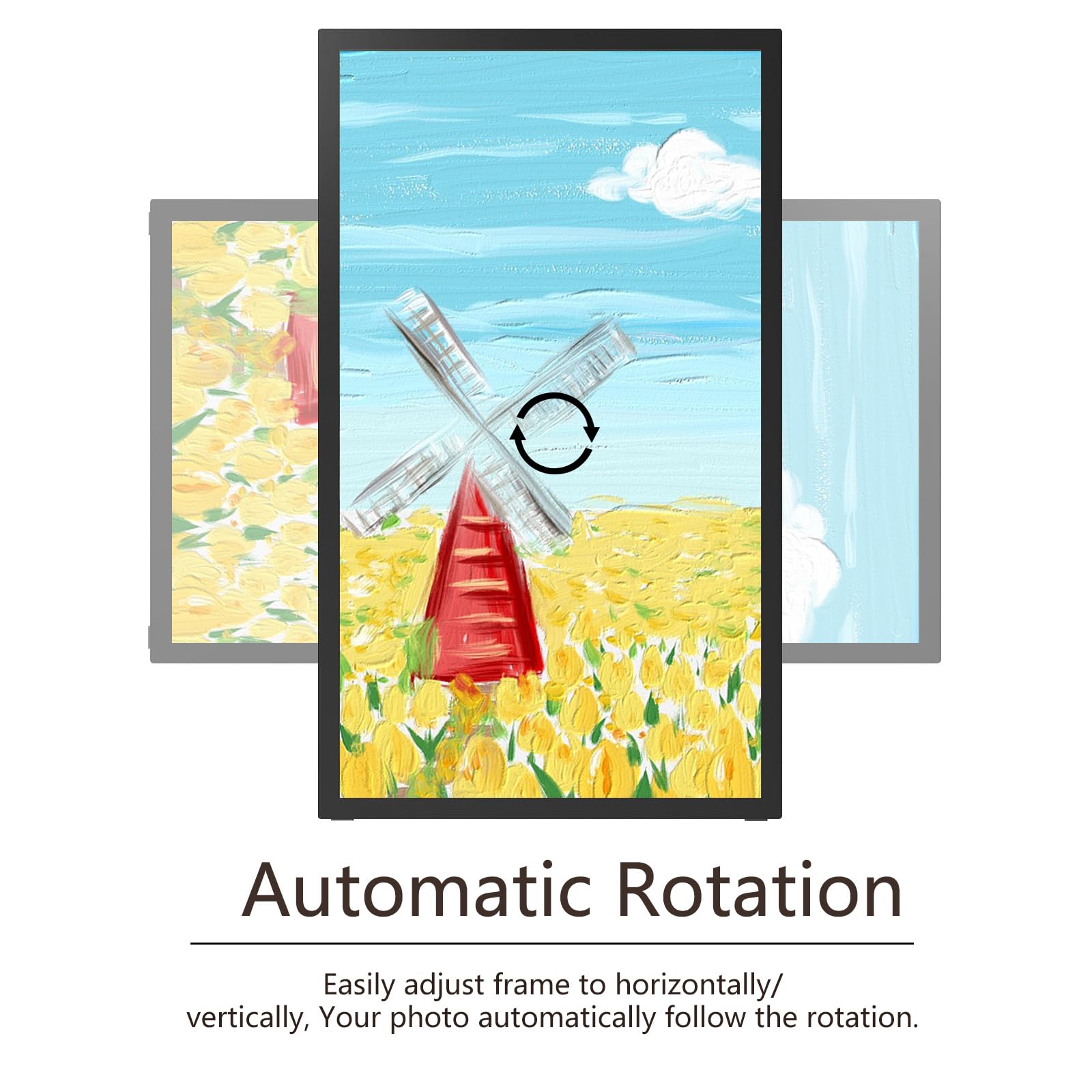 - 【IMPRESSIVE FUNCTIONS】 Akimart WiFi digital picture frame can automatically rotate photos to adjust the direction, Come with a detachable holder as a frame stand, allowing you to view the photos in either portrait or landscape mode. Display caption, weather and clock, you can sett turn on or off. Multifunctional custom settings, such as play order, image zooming, hide/publish images, adjustable brightness, sleep mode, etc.