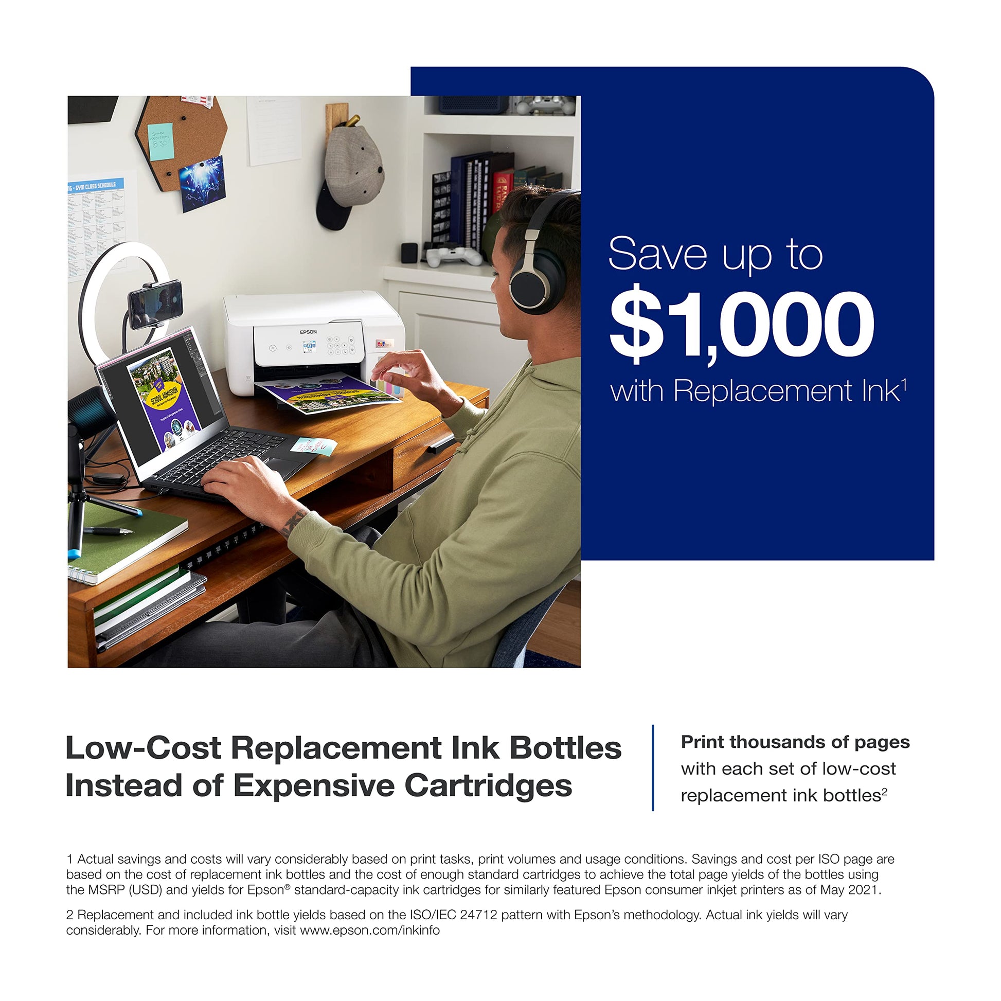 - Dramatic Savings on Replacement Ink , Save up to 90% with replacement ink bottles vs. ink cartridges (1) - that’s enough to print up to 4,500 pages black/7,500 color (3)