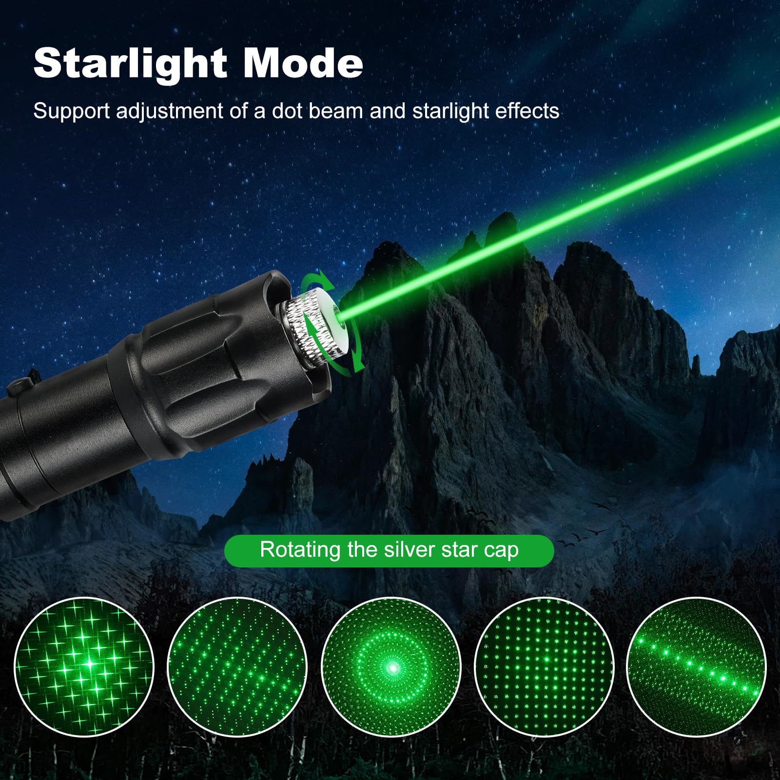 - 【High-Performance Beam】Our green laser pointer features a powerful laser that delivers a bright and focused beam. By rotating the bezel, you can adjust the light from a concentrated spot to a wide floodlight, making it suitable for both close-up tasks and long-distance illumination.