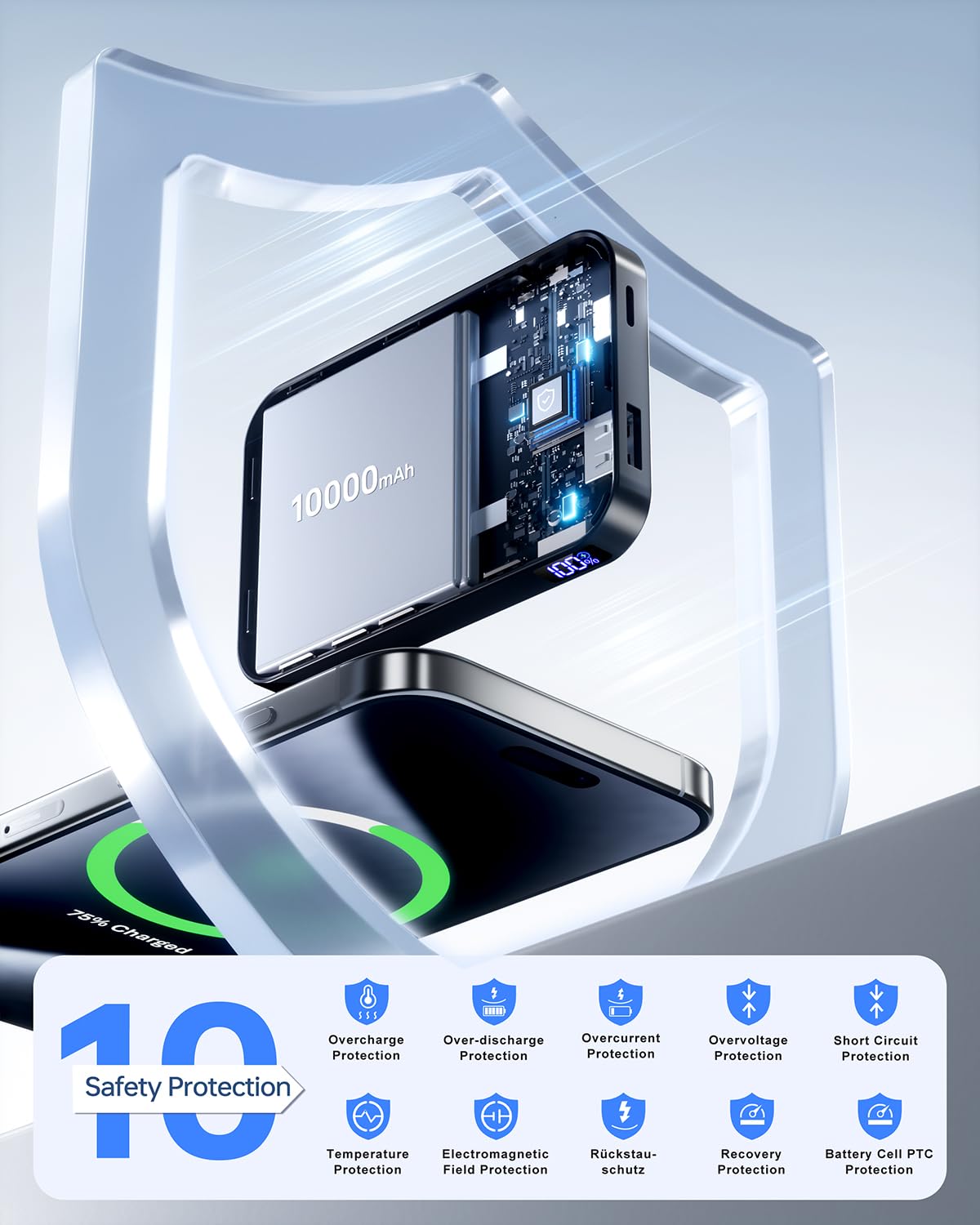 - Safe Charging You Can Trust: Your safety comes first. This MagSafe battery pack features advanced protection against overcharge, overheating, and short-circuiting to keep every charge stable and reliable. We stand behind our product with 18 months of friendly after-sales support and a 30-day hassle-free return policy — reliable power made simple.