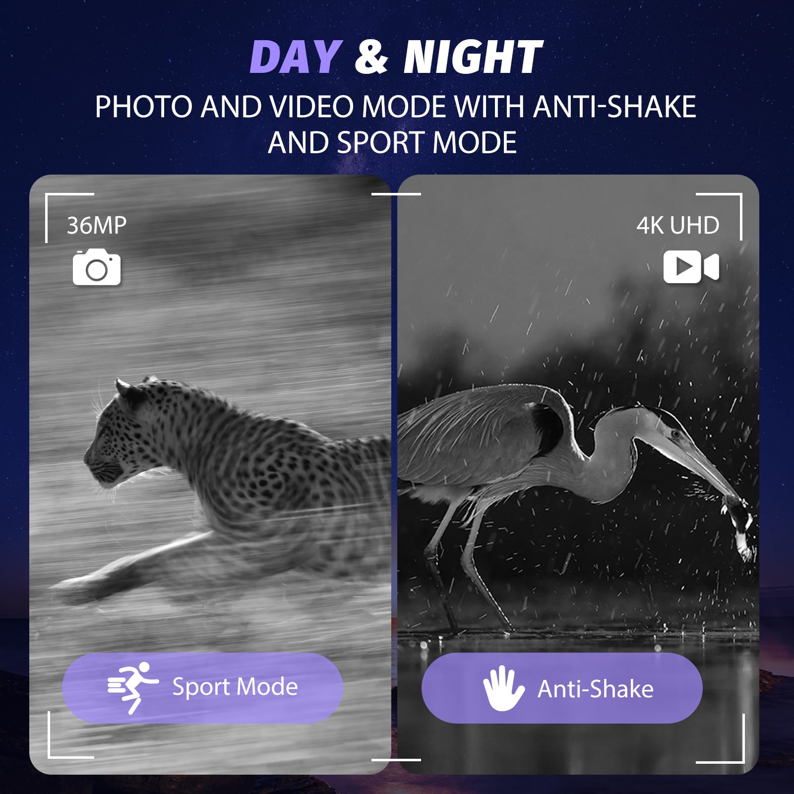 - Full High 4K Video & 36MP Picture: The night vision binoculars achieves 4K HD video and 36 million pixels photos. The motion detection function can be turned on when shooting videos of running animals, and the pictures also have an anti-shake function