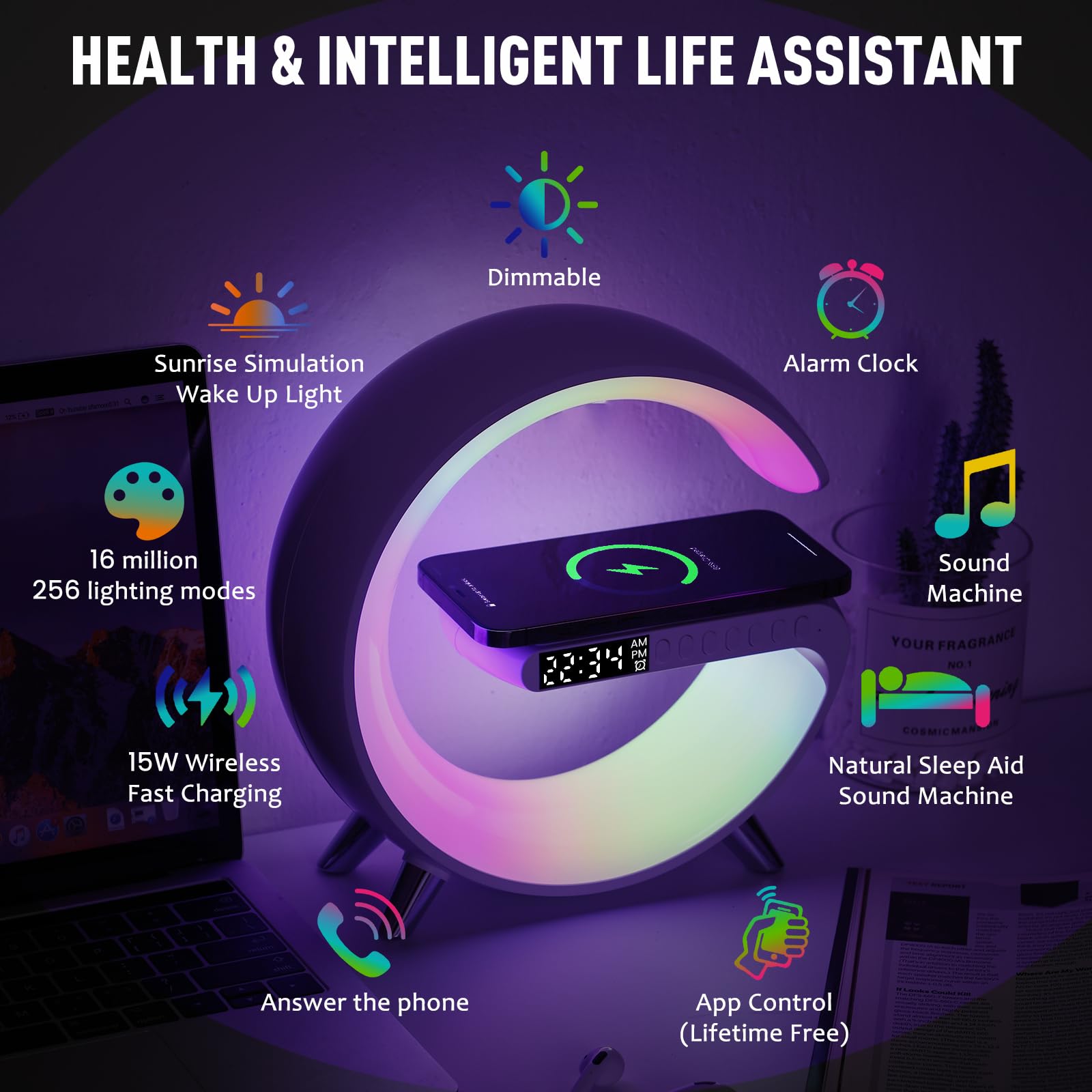 - 【4 in 1 Multifunctional Wireless Charging Atmosphere Light】: Newly upgraded G-shaped design. The lamp is not only an atmosphere light, Bluetooth speaker, music, sleep light, atmosphere light, bedside light, glare effect, Bluetooth audio, clock, alarm clock and other functions. You can use this great light while working, studying, reading and sleeping.
