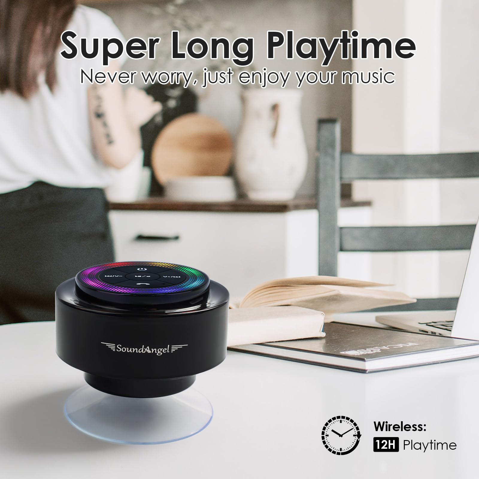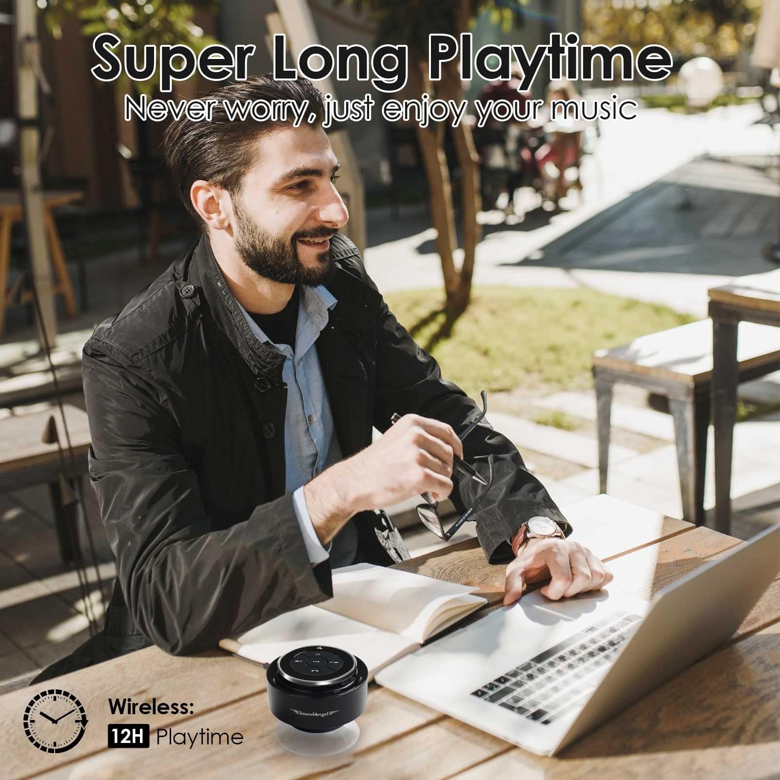 - ♬【Long Playtime - Enjoy it】 SoundAngel Mate shower speaker built in 1200mAh polymer battery, get over 8-12 hours at 50-80% volume. Don't worry about playback time.